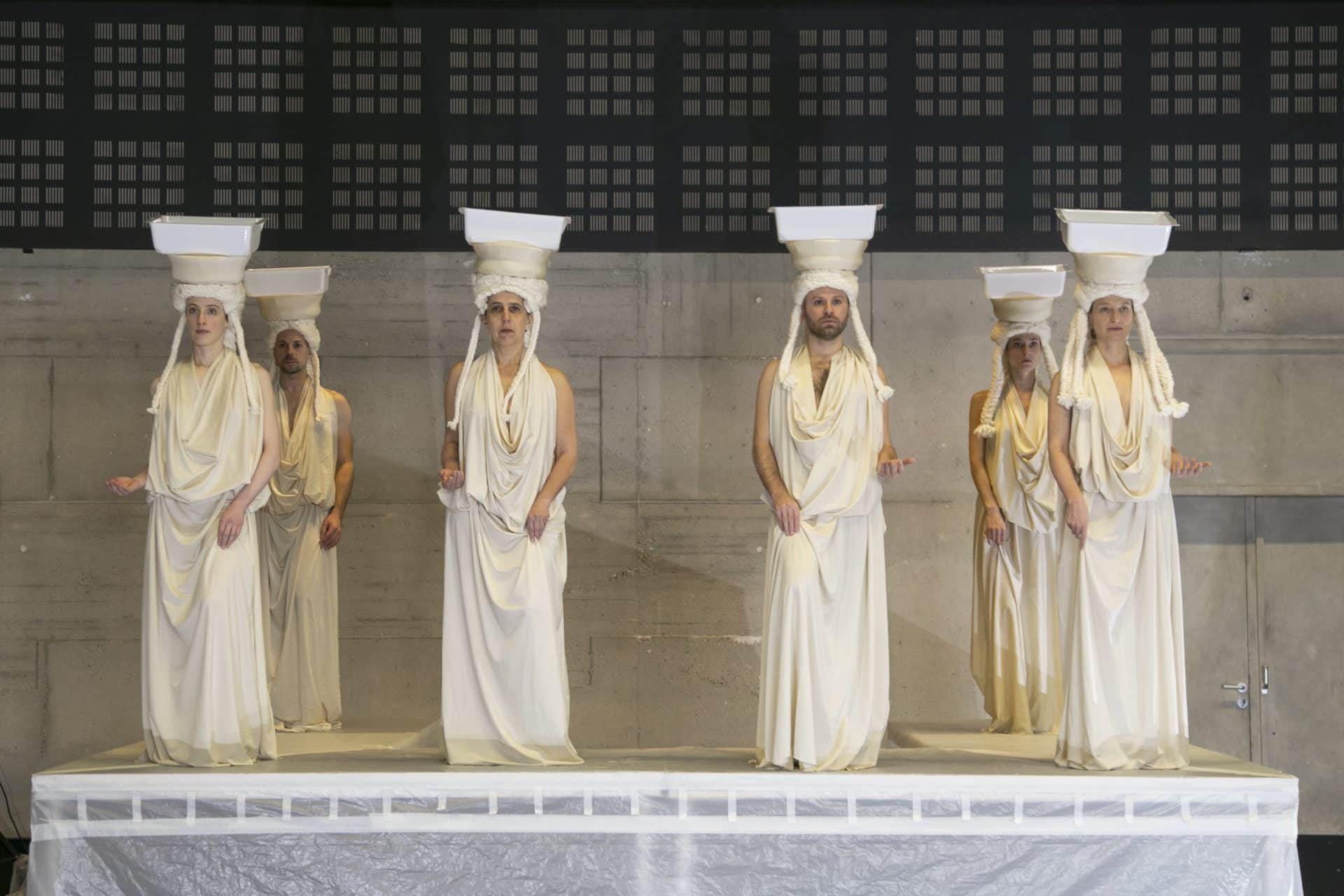 Autour d’eux les cariatides orchestrent leur séparation et tentent de regagner leur liberté. Orchestrant le vol et le départ d’une des leur. Errant dans leur nudité originelle à la recherche d’une échappatoire et d’une justice, brisant ce qui les constitue dans une dernière danse.